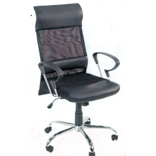 The professor desk chair as shown features a leather look with black mesh inserts, arm rests, tilt, chrome base. Measures 65 x 62 x 121. I01.