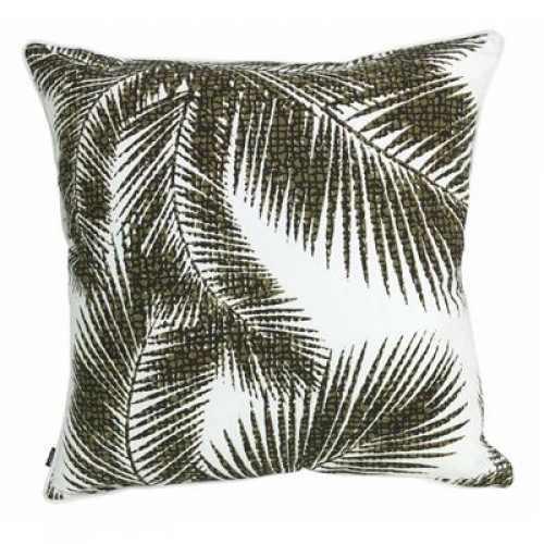 The Havana Cushion is 43 x 43 cm. The cushion is white with a green palm leaf print with a White piping border. J Elliot Home.