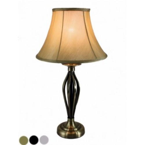 The twist base lamp is available in antique brass, black or satin chrome and the shade comes in white or gold. 52 cm high and 30 cm wide.