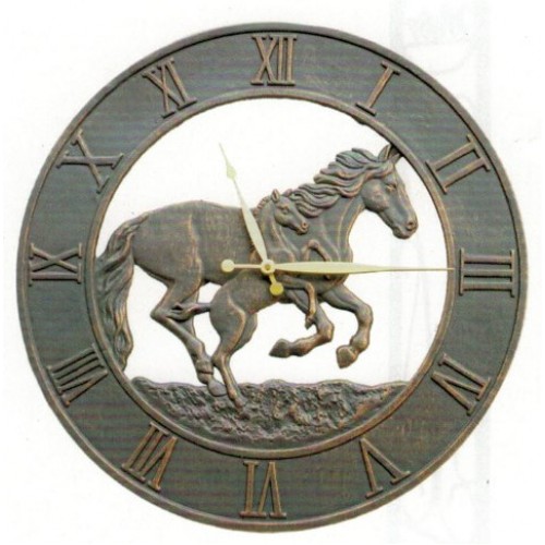 The Running Horses clock as shown is made from cast aluminum and has a tough long-wearing powder coat finish with hand painted gold highlights. Measures 58 cm in diameter. G12.